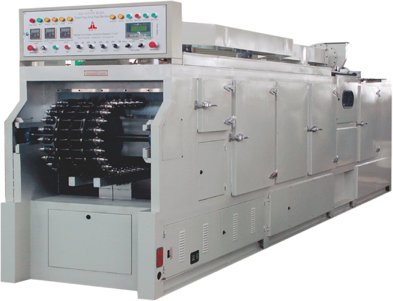 This machine is widely used in preheating, varnishing and drying of rotors of such as electric tools, motorcycle starter motors, automobile motors, DC servo motors, permanent magnet motors, series-excited motors and marine DC motors. This machine adopts Mitsubishi PLC, imported frequency converter speed regulation, pneumatic and mechanical combination structure, adopts sprocket rotary motion, so that the chain produces stepping motion, positioning and conveying, rotating while?rolling, with accurate displacement, uniform?distribution of painting time. This machine has three-stage constant temperature control, external paint supply and paint tank water cooling device,high production efficiency, simple and convenient operation.