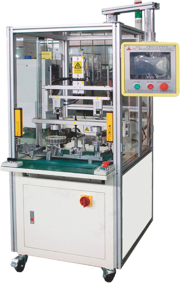 本機(jī)用于無刷電機(jī)外繞定子的自動繞線,更換工裝后可繞不同的電機(jī)定子,工作后可自動繞線,排線,分度,拉線入槽,自動剪線等動作,實(shí)現(xiàn)全自動繞線,排列整齊,繞線速度快,生產(chǎn)效率高。工業(yè)級人機(jī)界面,彩色觸摸屏操作。專業(yè)化界面設(shè)計(jì),操作方便快捷。 嵌入式模塊化設(shè)計(jì),功能強(qiáng)大,客戶可根據(jù)自己需求自行編程。以EEPROM存儲,最短保持十年。